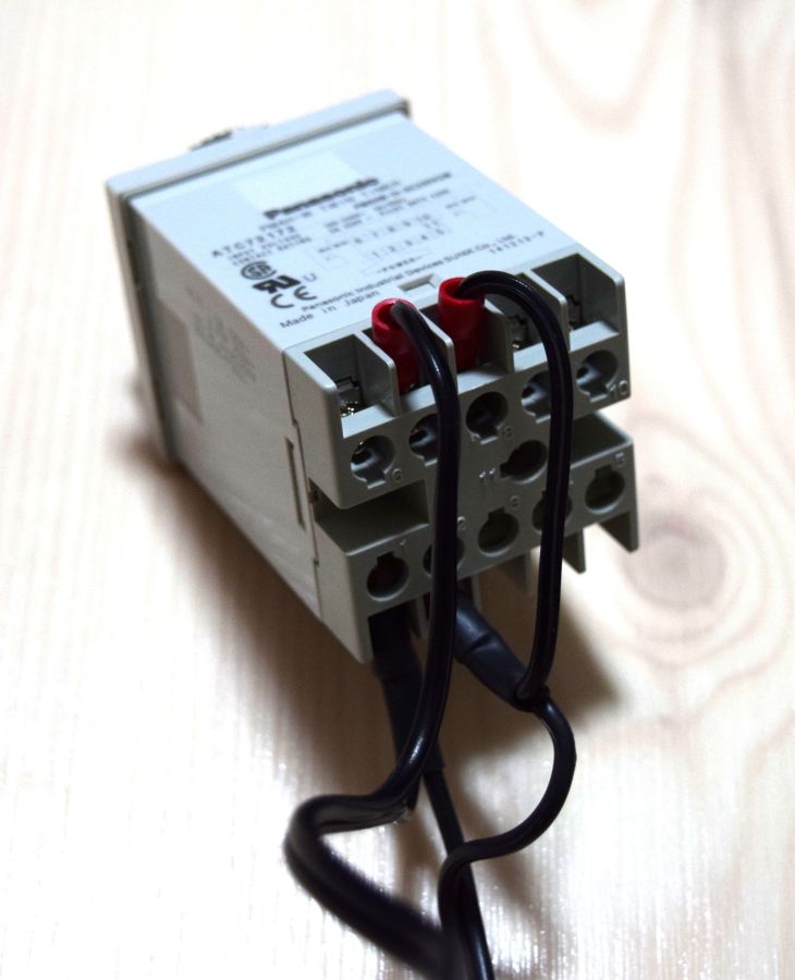 パナソニックのツインタイマーを用いました。電子タイマーも使用可能ですが、設定が面倒ですし、型番によっては繰り返しタイマーとして使用できないタイプもありますので注意が必要です。盤面左下のプラスドライバーでOFF時間の単位を任意に設定可能です。右下はON時間の単位を変えられます。sec,min,hourと変化します。on,offの時間は0.1秒から500時間(約20日)まで設定可能です。詳しくはPM4H-W ツインタイマーをご参照ください。時間の設定はダイヤルで簡単です。